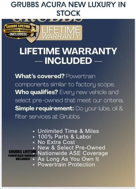 Plus every new Acura at Grubbs comes with our Lifetime Powertrain Warranty included.