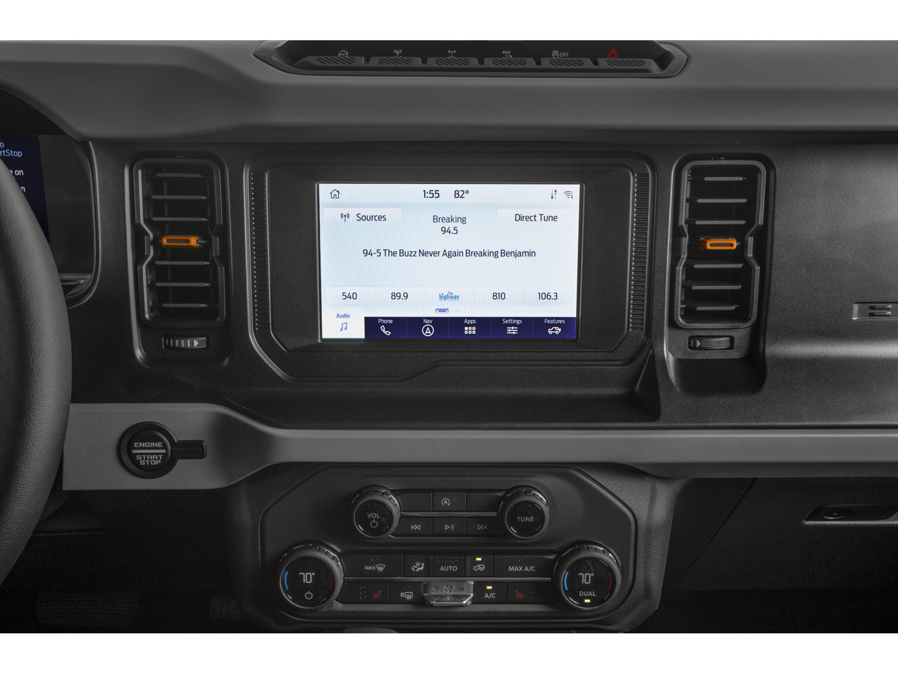 The interior of the Bronco Base is designed with your comfort and convenience in mind. Dual-zone climate control, heated front seats, and ambient footwell lighting create a luxurious and inviting environment, while the intuitive SYNC 4 infotainment system with connected navigation keeps you connected and informed on the go.