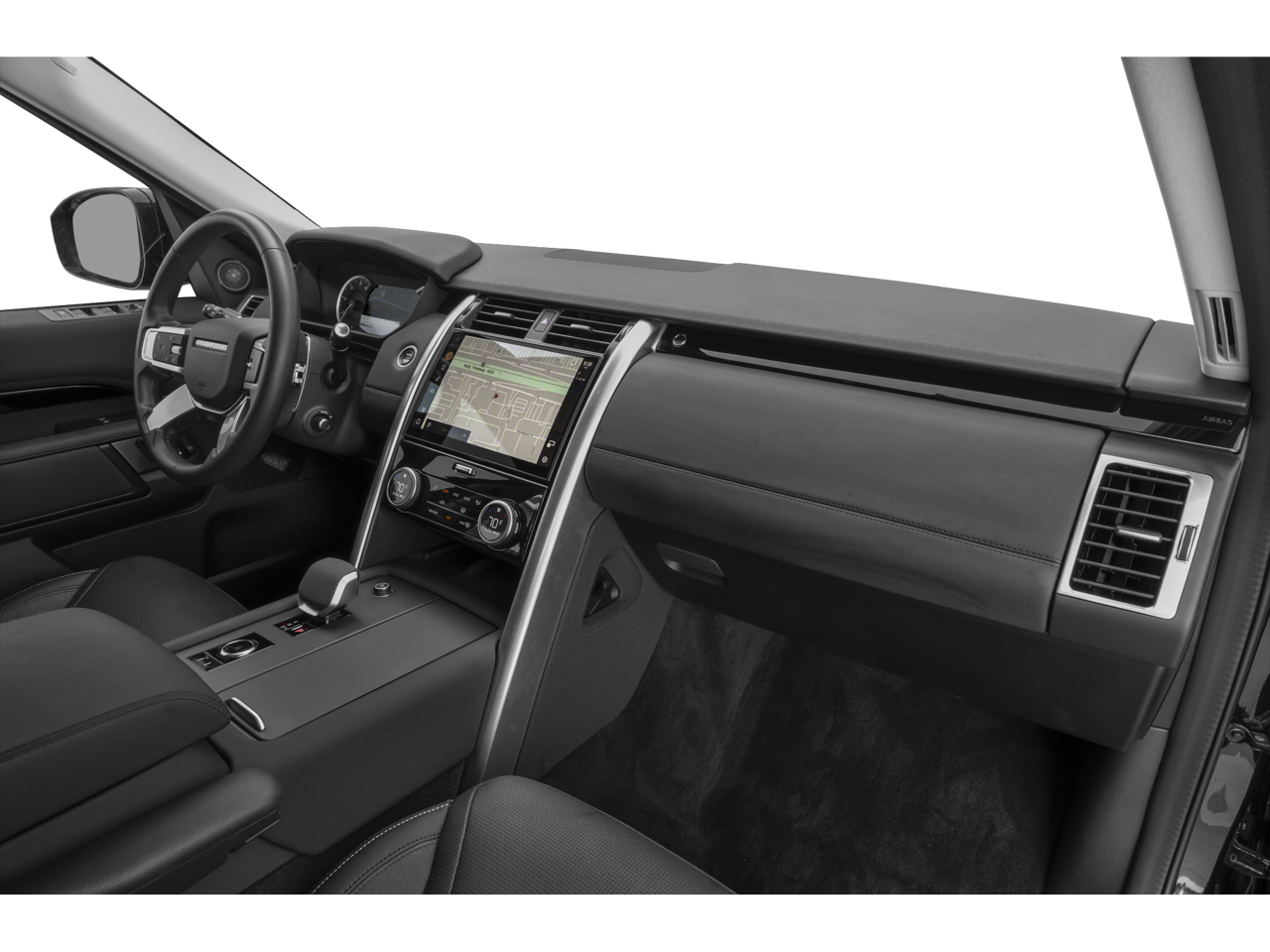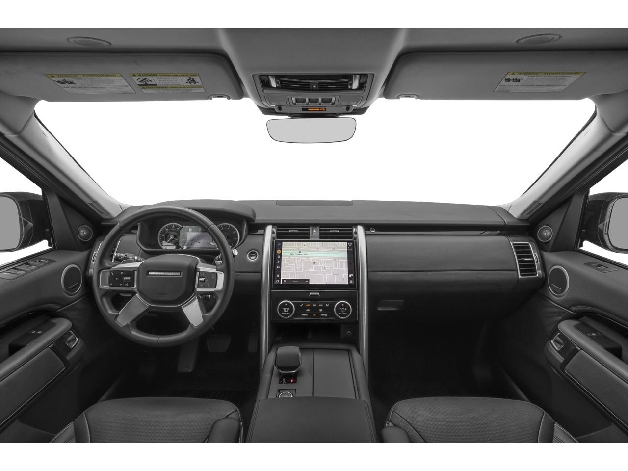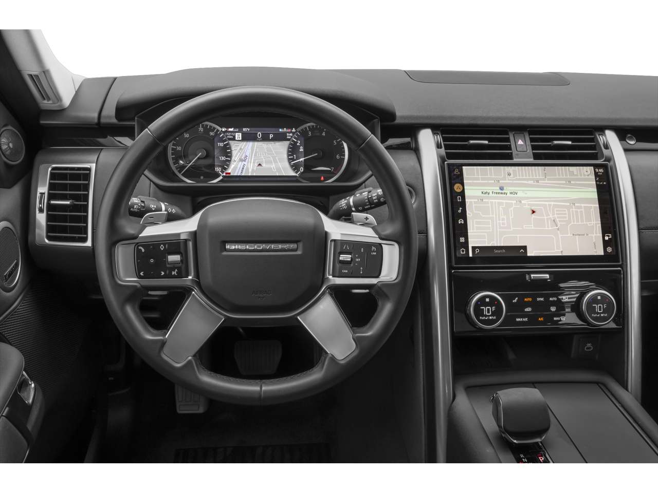 The exterior of this Discovery is adorned in a sleek White finish, complementing the vehicle's striking presence. The 20 5-Split Spoke in Satin Dark Grey alloy wheels add a touch of sophistication, while the rain-sensing wipers and speed-sensitive windshield wipers ensure optimal visibility in any weather conditions.