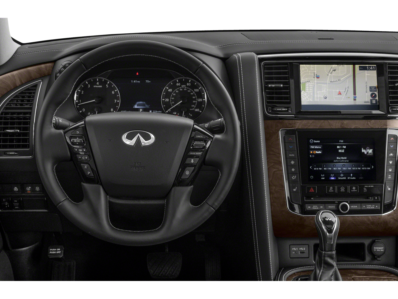 - Radio: Bose Premium Audio System w/13 Speakers -inc: driver's audio stage, speed-sensitive volume control, INFINITI InTouch 12.3" interactive display, INFINITI InTouch services (1-year premium trial and 5-year select trial), INFINITI navigation w/lane guidance and 3D building graphics, MapCare w/over-the-air update compatibility (5-year trial period), premium traffic w/live traffic information (5-year trial period), TomTom weather (5-year trial period), HD radio technology, Apple CarPlay w/wireless Apple CarPlay integration, Android Auto, Siri Eyes Free, Wi-Fi hotspot (30-day or 1GB trial, whichever comes first), Alexa built-in, SiriusXM radio (3-month trial period), SiriusXM Traffic (3-month trial period), SiriusXM Travel Link (3-month trial period): weather, fuel prices, stock prices, sports scores, movie listings and parking, over-the-air head unit update capability (5-year trial period), INFINITI Voice recognition for audio, navigation, Bluetooth® and vehicle information, Bluetooth® hands-free phone system and streaming audio, hands-free text messaging assistant, 2x USB ports for compatible devices for audio streaming and wireless phone charger